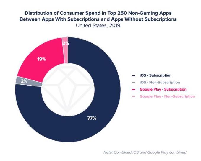 Subscriptions are now the primary way many non-gaming apps generate revenue. For example, 97% of consumer spending in the top 250 U.S. iOS apps was driven by subscriptions, and 94% of the apps used subscriptions. On Google Play, 91% of the consumer spending was subscription-based, while 79% of the top 250 apps used subscriptions.