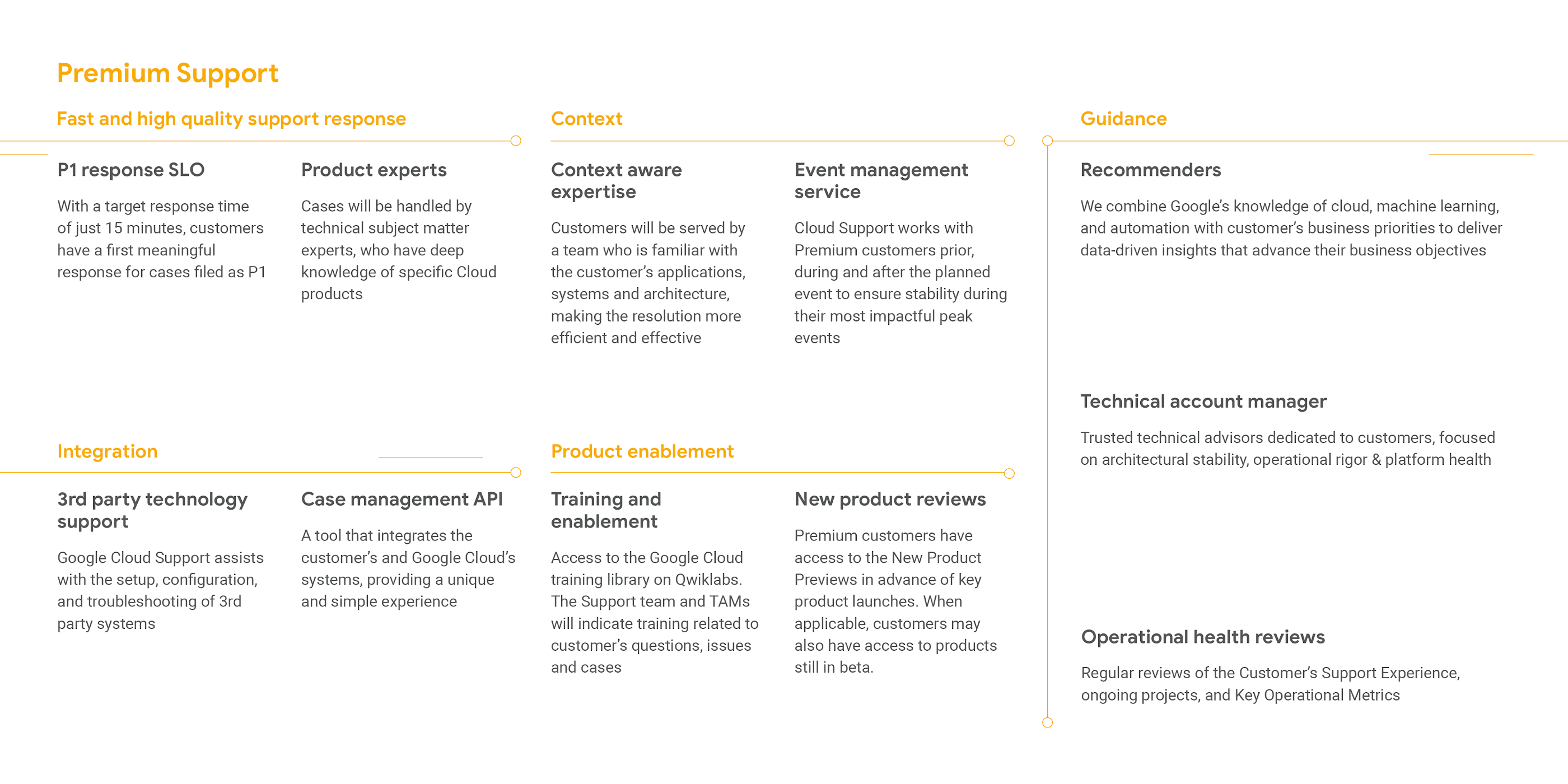 “Premium Support has been designed to better meet the needs of our customers running modern cloud technology,” writes Google’s VP of Cloud Support, Atul Nanda. “And we’ve made investments to improve the customer experience, with an updated support model that is proactive, unified, centered around the customer, and flexible to meet the differing needs of their businesses.”