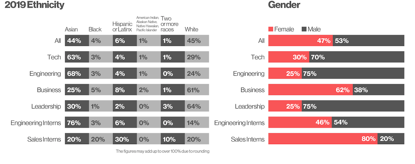 Of course, for a company with 2,000 employees worldwide, it won’t be easy to dramatically increase overall representation. But given its mild gains, it does seem to be trying.