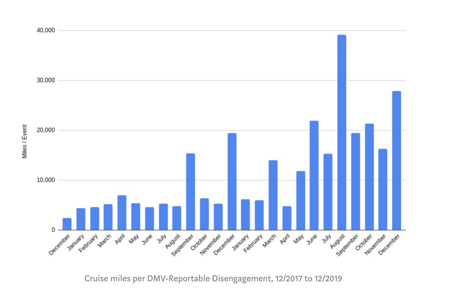 These disengagement reports will be released in a few weeks. Cruise did share some of its disengagement data, specifically the number of miles driven per disengagement event, between 2017 and 2019.