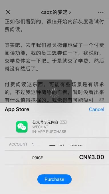 Unlike tipping, the new paywall feature entitles Apple to its standard 30% cut of in-app transactions. That means transfers for paid content will go through Apple’s in-app purchase (IAP) system rather than WeChat’s own payments tool, as is the case with tipping. It also appears that only users with a Chinese Apple account are able to pay for WeChat articles. TechCrunch’s attempt to purchase a post using a U.S. Apple account was rejected by WeChat on account of the transaction “incurring risks or not paying with RMB.”