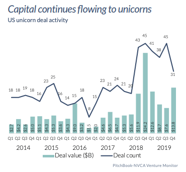 Returning to the Pitchbook and NVCA report, one more bit of data: according to their calculations, U.S.-based unicorns saw their fundraising pace drop sharply in Q4 2019.