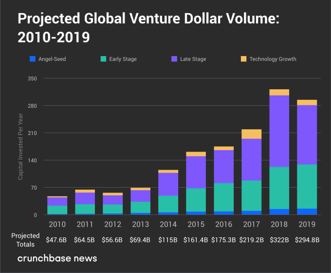 This chart marks 2019 as, yes, a let-down of sorts from the 2018 global venture results in dollar terms. But it also highlights 2019 as an incredible year for global venture investment when considered in longer historical context.