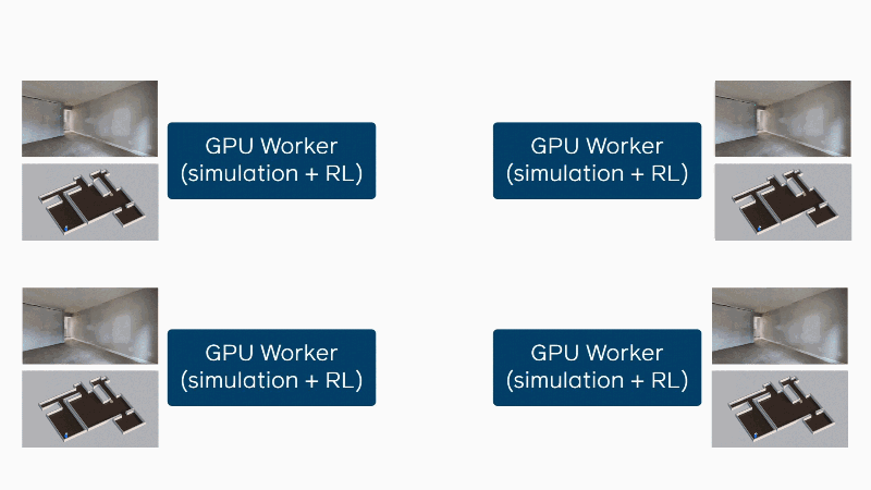 Such simulators, which are common in robotics and AI training, are also useful because, being simulators, you can run many instances of them at the same time — for simple ones, thousands simultaneously, each one with an agent in it attempting to solve a problem and eventually reporting back its findings to the central system that dispatched it.