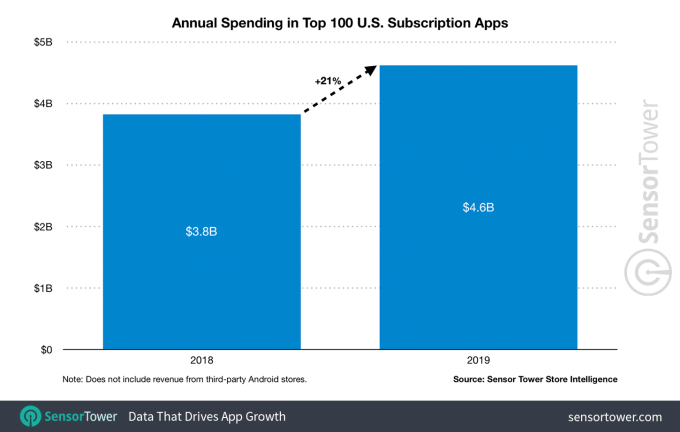 Outside of in-app purchases in mobile games, subscription revenue from non-game apps helped to boost 2019’s mobile consumer spend — a figure that reached $120 billion globally last year, according to a recent report by App Annie. Now, new data from app intelligence firm Sensor Tower indicates U.S. subscription app revenue grew by 21% last year from the $3.8 billion generated by the top 100 subscription apps to reach over $4.6 billion in 2019.