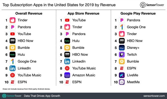 Breaking down the consumer spending on subscriptions in the U.S. App Store, specifically, the report found that users spent $3.6 billion in the top 100 subscription apps of 2019, up 16% from the $3.1 billion spent in 2018. YouTube was the top subscription app on the U.S. App Store, followed by Tinder. In 2019, YouTube crossed the $1 billion milestone through in-app spending, including for its ad-free tier, YouTube Premium, which it heavily promotes. On Google Play, however, Tinder was No. 3, behind Pandora and Google One (cloud storage across Google platforms).