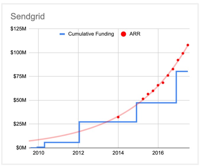 SendGrid is the only example that comes close to meeting this bar. Its ARR was ahead of capital raised for at least 10 quarters prior to the IPO, and possibly longer. This is an accomplishment unmatched by any other company in the data set.