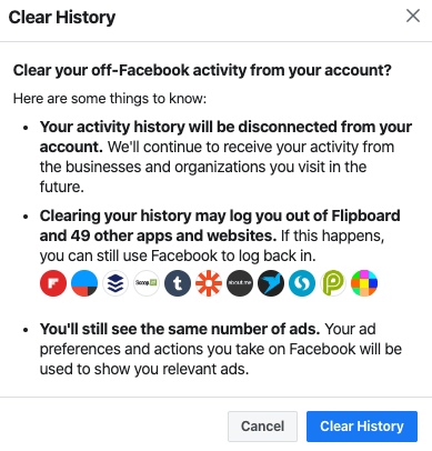 The feature is complicated — it would not be surprising to see hundreds of sites and apps in your list of apps and sites sharing data with Facebook. It also requires Facebook users to enter their password again to view this tool, even if they’re currently logged in. The “clear history” button doesn’t stop the third-parties from future data-sharing — that’s a whole different section. And finally, it warns you that clearing history will log out of dozens of apps and won’t prevent you from seeing ads — warnings obviously intended to get users to reconsider.