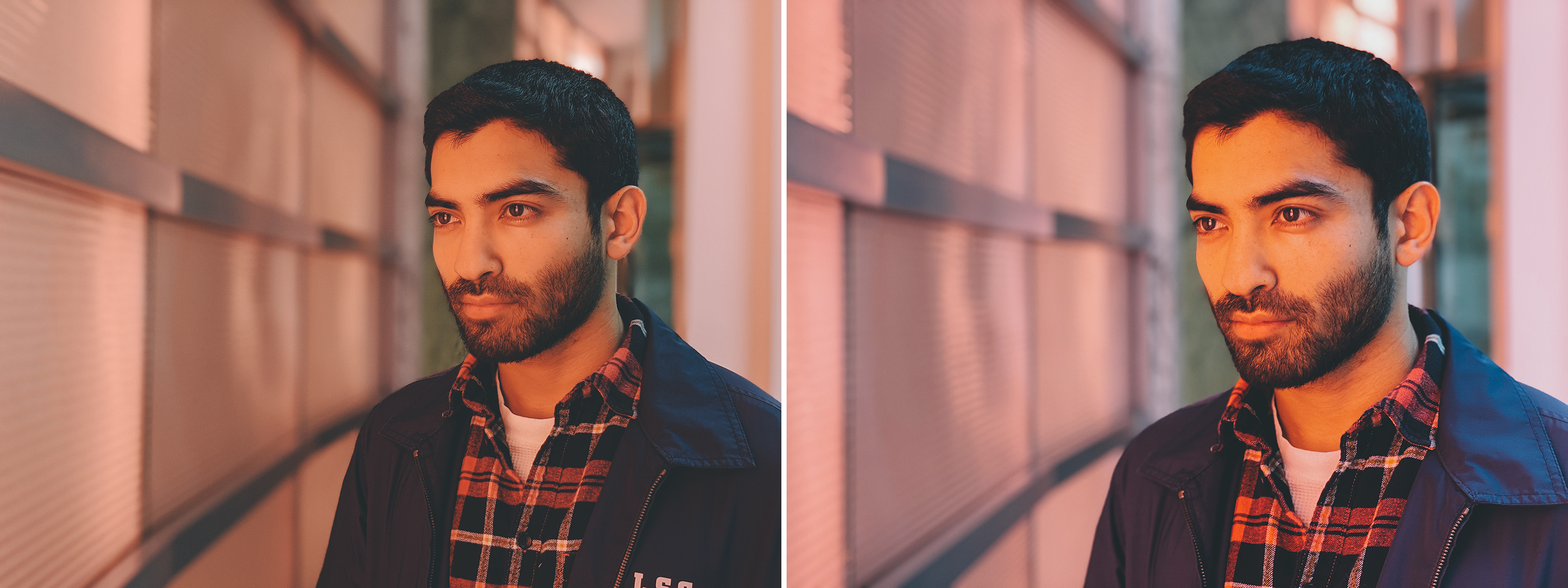 Arman suffused in pinkish-red light, backlit with afternoon window light. Both were shot from the same distance.