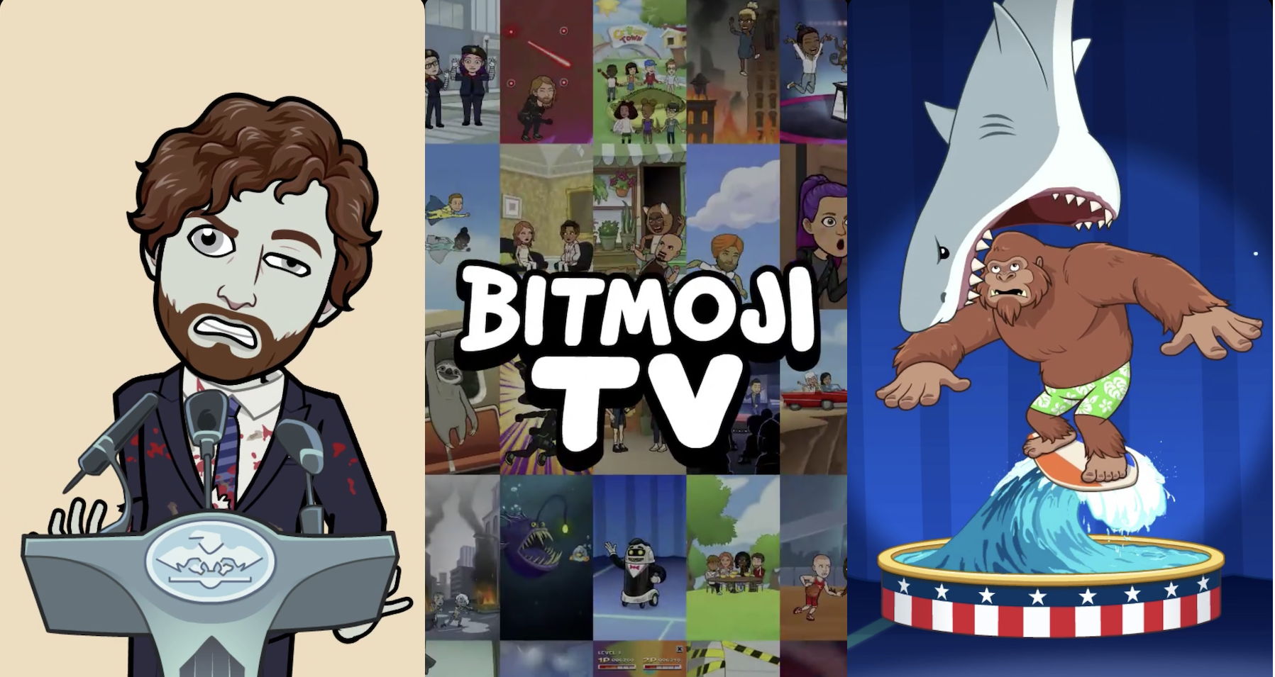 The show is designed to be PG-13, with some bleeped out swearing and a little bloody violence. The shows are made out of Bitmoji’s Toronto office and are based on North American TV, film and advertising. Each episode cuts away and back to a main story, with the first two centered around an America’s Best Bitmoji game show and a Mime Cops hostage negotiation. Interspersed are “channel flips” between shorter single-gag clips that take your avatar into sit-coms, soap operas, action movies and infomercials.