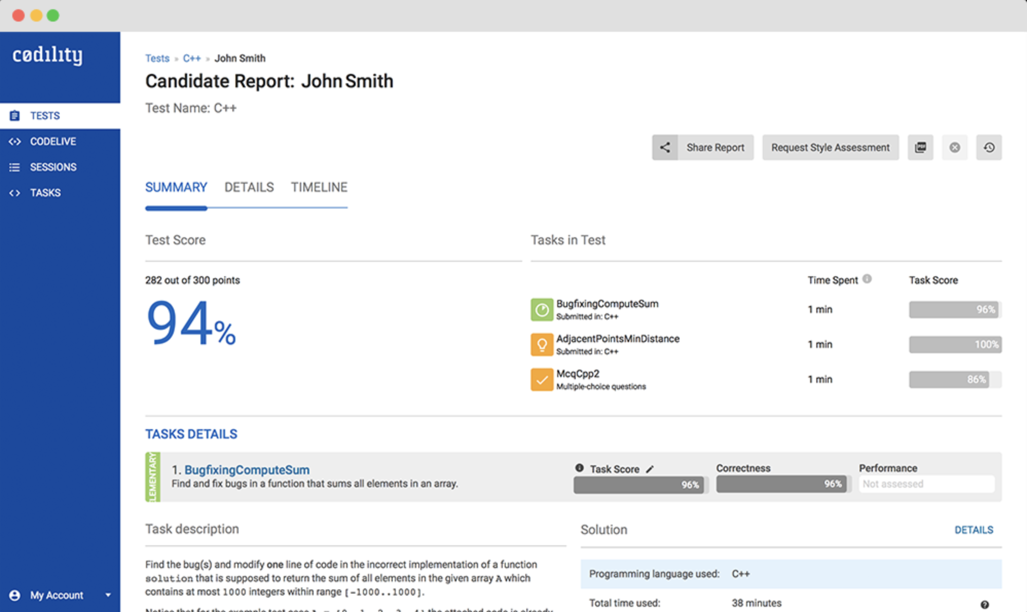 What sets Codility apart from similar platforms is that it aims to provide coding tests that are closer to what engineers typically face in their day-to-day jobs instead of highly abstract whiteboarding sessions that evaluate their theory of algorithms knowledge.