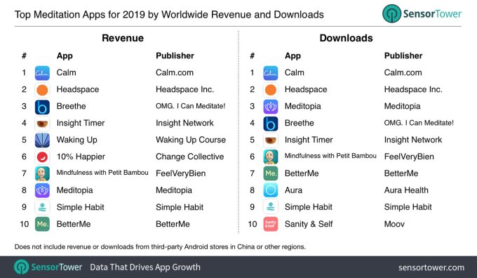 Only two apps, however, have been in the top 10 list since 2015. Calm, which is estimated to have grossed $92 million in 2019, and Headspace, which grossed $56 million. Both saw revenues up year-over-year, as well, at 46% and 33%, respectively.