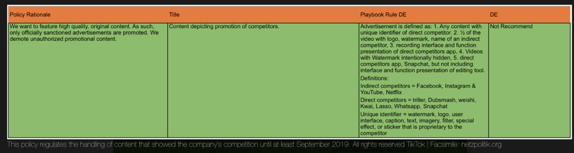 TikTok has already taken notice. Shown in a leak of its moderation guidelines from Netzpolitik, the company’s policy is to downrank the visibility of any video referencing or including a watermark from direct competitors, including Dubsmash, Triller, Lasso, Snapchat and WhatsApp. That keeps Dubsmash videos, which you can save to your camera roll, from going viral on TikTok and luring users away.