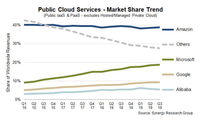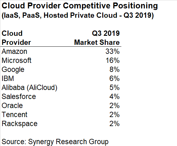 If you look at pure cloud infrastructure and platform services, Synergy shows Amazon with 39% and Microsoft with 19% in most recent analysis at the end of last October.