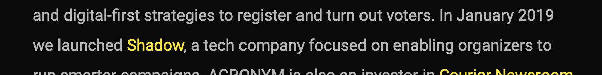 Language on ACRONYM’s about page has been changed from “In January 2019 we launched Shadow, a tech company focused on enabling organizers to run smarter campaigns” to “In January 2019, we invested in Shadow, a tech company focused on enabling organizers to run smarter campaigns” (emphasis ours).