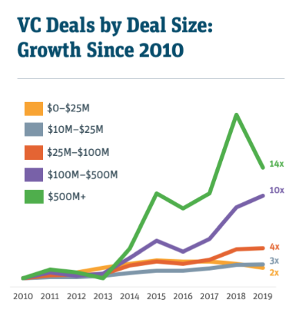 Now dollar amount and stage are not perfectly correlated. You can pull together a small yet late-stage round for example. And some early-stage rounds are huge. But there is a correlation between early-stage rounds and smaller deal sizes in dollar terms, just as there is a connection between late-stage rounds and larger investment sums.
