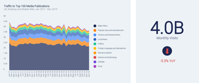 News sites, for instance, were losing traffic. The report found that traffic to the top 100 media publications is down 5.3% year-over-year from 2018 to 2019 (a loss of 4 billion visits), and down by 7% since 2017.