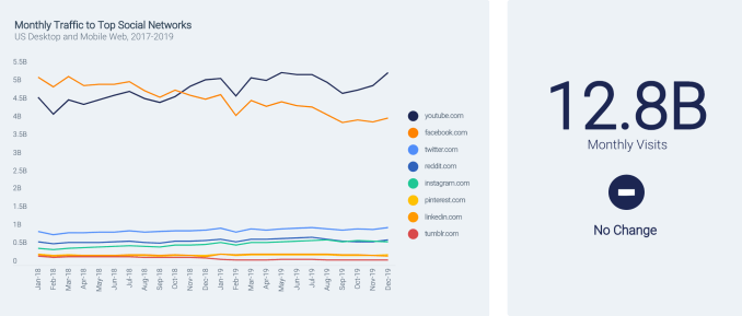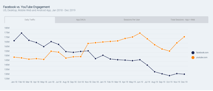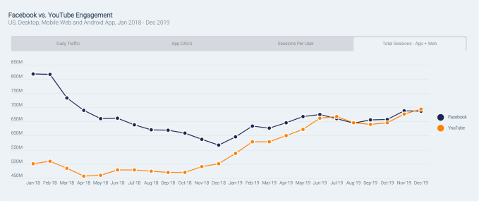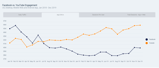 Facebook fought off the web traffic declines and related declines in app usage by re-engaging existing users in 2019, which helped it to increase the total number of app sessions throughout the year. YouTube uses a similar tactic to increase its own app engagement figures, leading to a close tie between the two on this metric.