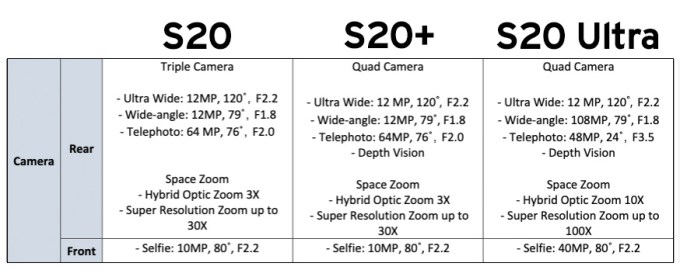 The S20 has three cameras, the beefiest of which is a 64-megapixel telephoto lens. The S20+ and S20 Ultra bump it up to four cameras with the introduction of a depth sensor, and the S20 Ultra alone packs a rather wild 108-megapixel sensor on the wide angle lens. The camera specs vary quite a bit from model to model and it can all get pretty confusing, so here’s Samsung’s spec sheet breakdown for reference: