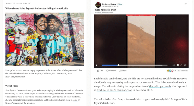 Baker acknowledged criticism of how slow Facebook is to direct hoaxes and misinformation to fact-checkers. While Facebook claims it can reduce the further spread of this content by 80% using downranking once content is deemed false, that doesn’t account for all the views it gets before its submitted and fact-checkers reach it amongst deep queues of suspicious posts for them to moderate. “One thing we have as an advantage of Reuters is an understanding of the importance of speed” Baker insists. That’s partly why the team will review content Reuters chooses based on the whole organization’s experience with fact-checking, not just what Facebook has submitted.