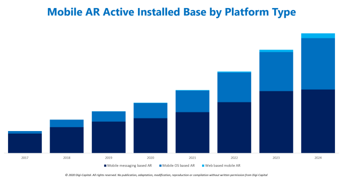 Source: Digi-Capital AR/VR Analytics PlatformMessaging-based mobile AR is the largest platform type today, as well as in long-term forecasts. Facebook’s mobile AR filters and lenses on Messenger and Instagram make it the largest company in the space, even with leadership from Snap and others. Yet, OS-based mobile AR platforms ARKit and ARCore (Google Play) could see the largest single-platform active installed bases by 2024.