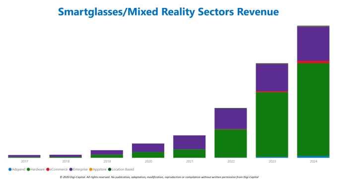 So together with unconfirmed reports of Apple delaying its smartglasses launch, Digi-Capital has pushed back its base case forecast of Apple launching smartphone-tethered smartglasses by two years from late 2020 to late 2022. This results in significant knock-on effects for the smartglasses market as a whole in the medium term. Yet if Apple does launch in this time frame, it could become the catalyst for the consumer smartglasses market (together with Samsung and others). That could also have positive impacts for the enterprise market due to bring-your-own-device (BYOD) demand.