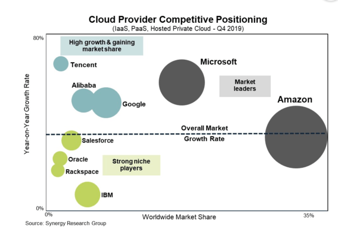 As with Google, Alibaba sits well in the back of the pack, as Synergy Research’s latest market share data shows. The chart was generated before yesterday’s report, but it remains an accurate illustration of the relative positions of the various companies.