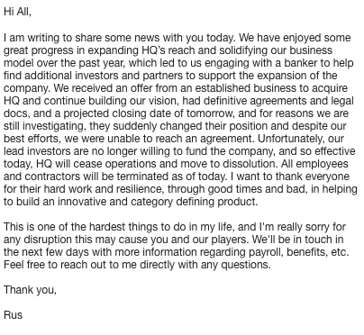 “We received an offer from an established business to acquire HQ and continue building our vision, had definitive agreements and legal docs, and a projected closing date of tomorrow, and for reasons we are still investigating, they suddenly changed their position and despite our best efforts, we were unable to reach an agreement,” Yusupov writes. “Unfortunately, our lead investors are no longer willing to fund the company, and so effective today, HQ will cease operations and move to dissolution. All employees and contractors will be terminated as of today.”