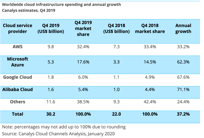 That’s not to say Microsoft didn’t still have a good quarter — it garnered 17.6% of revenue for the period. That’s up from 14.5% in the same quarter a year ago. What’s more, Amazon lost a bit of ground, according to Canalys, dropping from 33.4% in Q4 2018 to 32.4% in the most recent quarter.