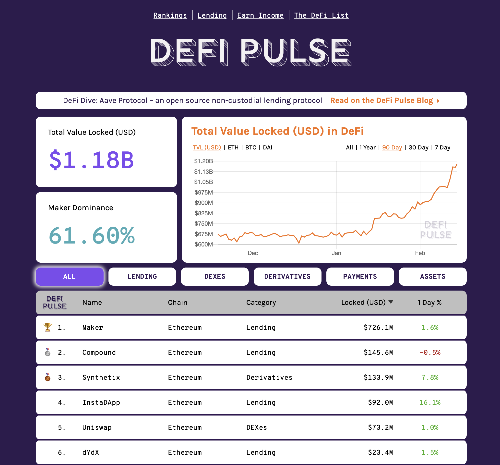 But there’s one thing for sure, DeFi is growing rapidly. As you can see on DeFi Pulse, there is currently $1.17 billion locked in smart contracts tied to various DeFi projects. Let’s go through some examples.