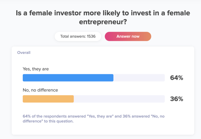 My study at TruePublic coincided with these findings. When asked if a female investor was more likely to invest in a female entrepreneur, 64% of people responded affirmatively (64% of these individuals were women and 63% were men).9