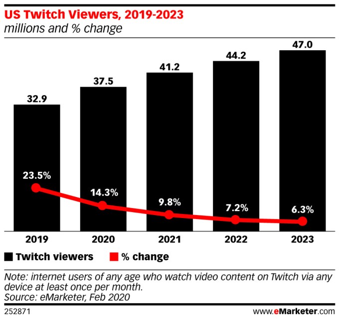 Twitch, the Amazon-owned streaming service for gamers, is poised to surpass 40 million monthly active viewers in the U.S. as of next year, according to a new forecast from eMarketer out on Thursday. By 2023, it will reach 47 million viewers. Currently, the analyst firm estimates Twitch has 37.5 million viewers in the U.S. who tune in to watch at least once per month.