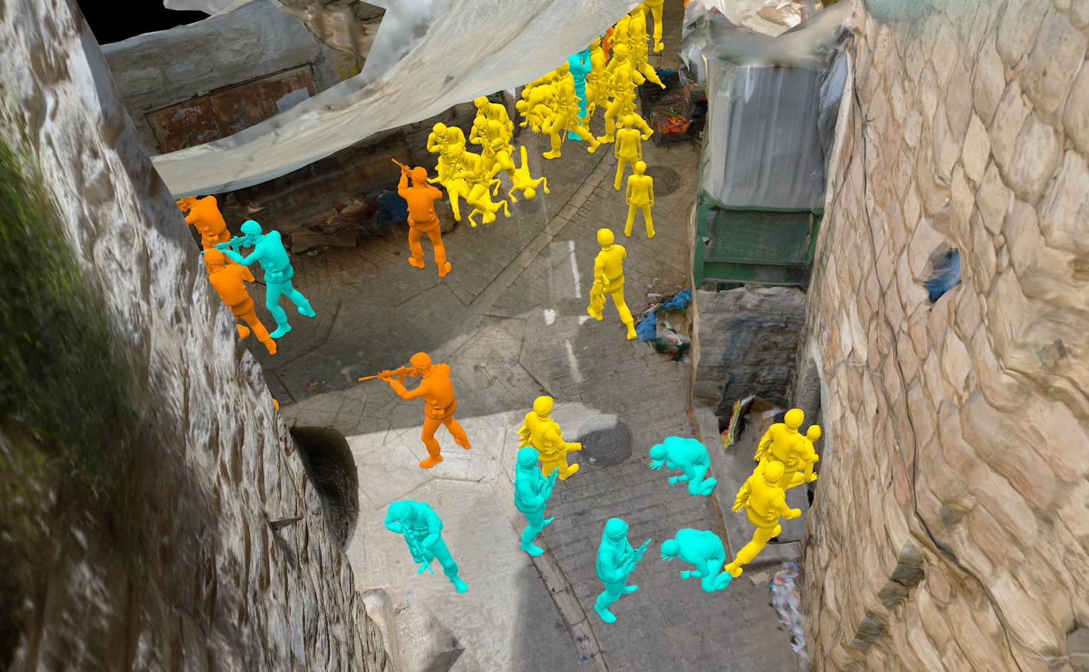 In video of the situated testimony, you can see witnesses describing locations more exactly than they likely or even possibly could have without the virtual reconstruction. “I stood with the men at exactly that point,” says one, gesturing toward an object he recognized, then pointing upwards: “There were soldiers on the roof of this building, where the writing is.”