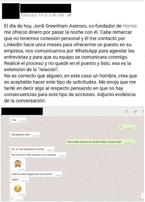 Today, Jordi Greenham Asensio, co-founder of Homie offered me money to spend the night with him. It should be noted that we do not have a personal connection and that he contacted me on LinkedIn a few months ago to offer me a job at his company, we communicated through WhatsApp to schedule the interviews and for his team to communicate with me. I carried out the process and I did not get the position and there, that is the extension of the “relationship”.