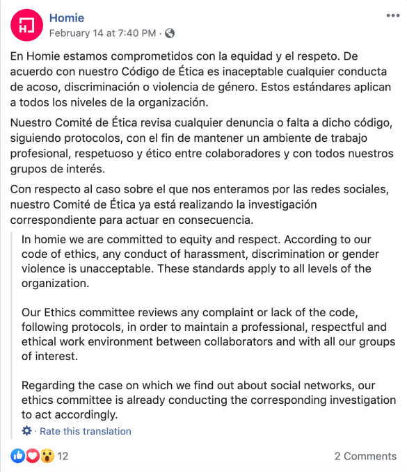 Homie’s February 14 Facebook post detailed that its code of ethics deems harassment, discrimination and gender violence to be unacceptable and that those standards apply to “all levels of the organization.”