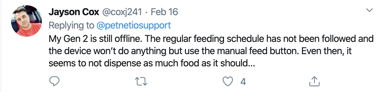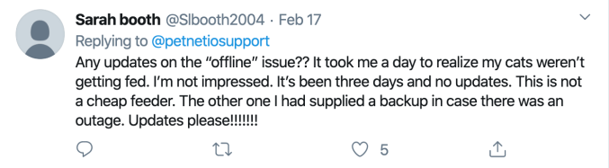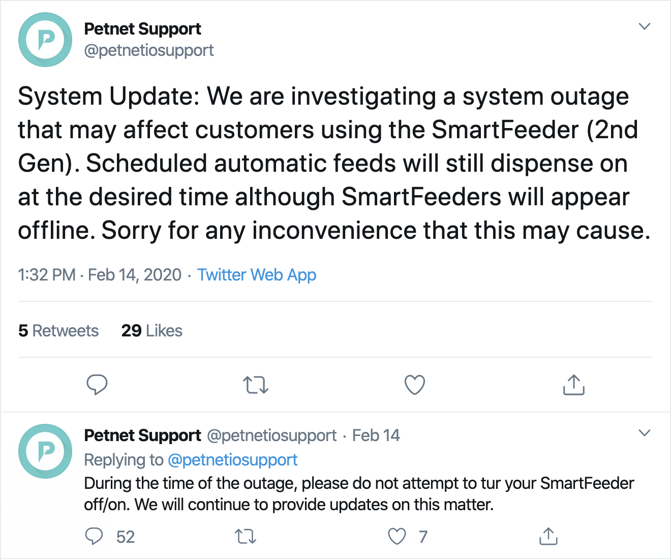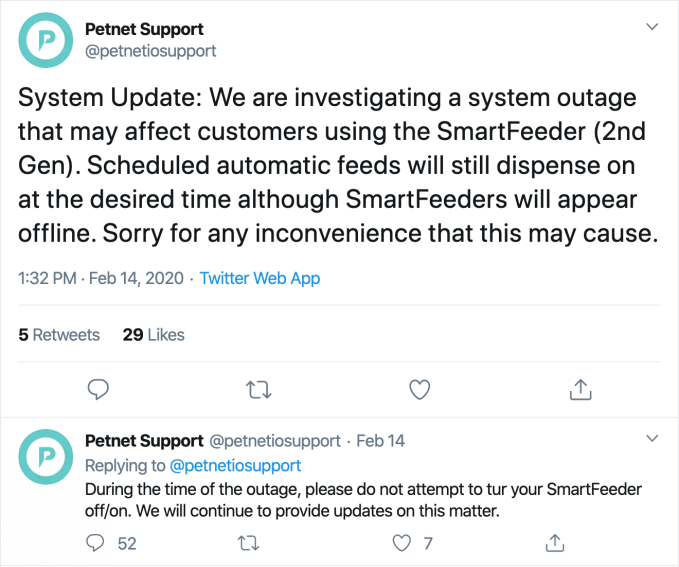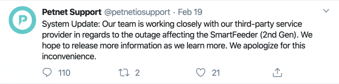 Petnet first announced on Feb. 14 that it was investigating a system outage affecting its second-generation SmartFeeders that made the feeders appear to be offline. The company said in a tweet that the SmartFeeders were still able to dispense on schedule, but several customers replied that their devices had also stopped dispensing food or weren’t dispensing it on schedule.