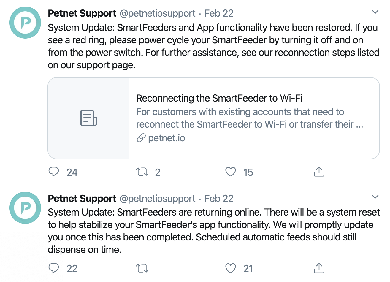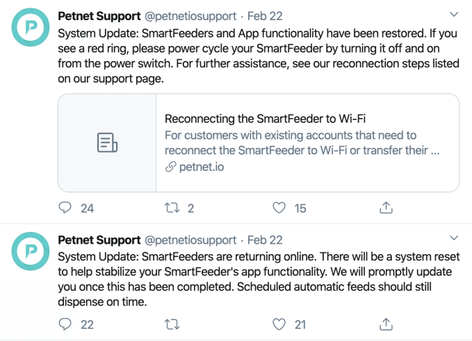 On Feb. 19, the company said that it is “working closely with our third-party service provider in regards to the outage,” before announcing on Feb. 22 that the SmartFeeders are returning online.