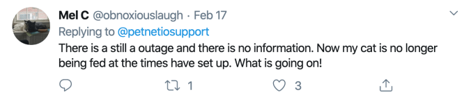 In a statement sent to TechCrunch over the weekend before Petnet said the outage was resolved, a Petco representative said, “Petco is a minor and passive investor in Petnet, but we do not have any involvement in the company’s operations nor insight into the system outage they are currently experiencing.”
