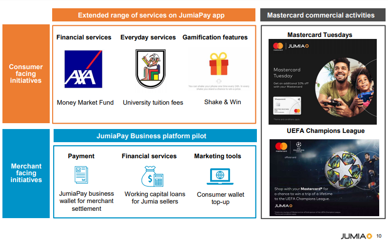 Jumia launched an Axa money market fund product in Nigeria in 2019 and some promotional programs on Mastercard’s network, as noted in page 10 of its investor presentation.