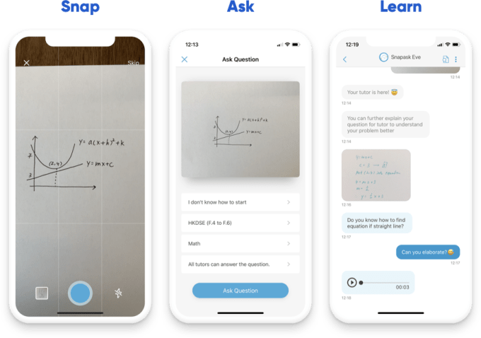 Other study apps focused on students some of the same markets as Snapask include ManyTutors and Mathpresso, whose products combine tutoring services with tools that let students upload math questions, which are then scanned with optical character recognition to provide instant answers. Yu says Snapask is focusing on one-on-one tutoring because it wants to differentiate by creating a “holistic experience.”