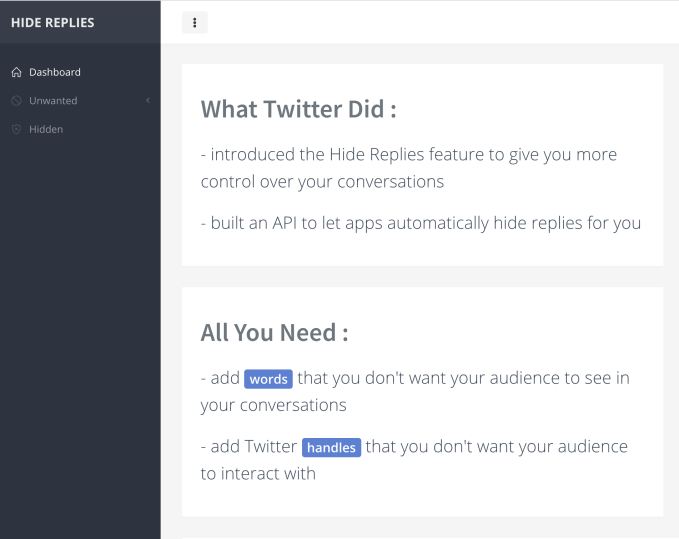 Dara Oladosu, the creator of the popular app QuotedReplies, also used the endpoint to build a new app called Hide Unwanted Replies. The app today automatically hides replies by keywords or Twitter handles. Soon, it will add support for hiding replies from likely troll or bot accounts — including tweets from user accounts created too recently or from accounts with few followers.