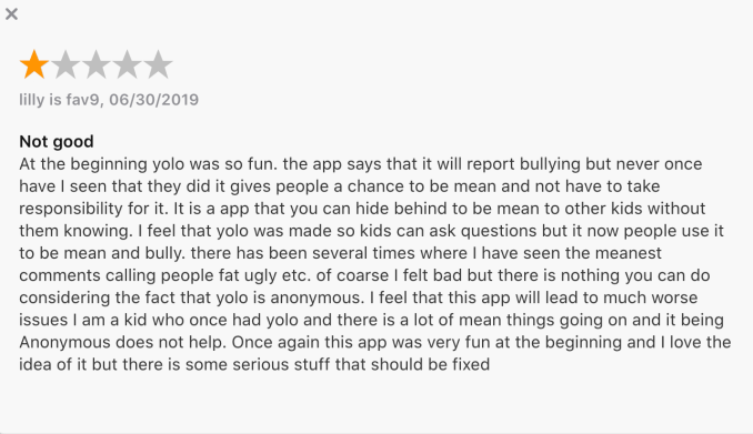 - Yolo, a SnapKit app for anonymous Q&A’s on Snapchat, raises $8 million. Popular with teens, Yolo has 10 million users and is a top 100 app. Most anonymous apps for teens have ended up overrun with bullying. Yolo has had bullying issues too. One of the bullied users is even trying to fight back. It’s unfortunate that investors keep backing these sorts of anon Q&A experiences. Adults can’t behave online, but they think kids can? Anonymity on an early participant in this space, Ask.fm, led to such bullying that the app was said to have contributed to multiple teen suicides. Why would anyone keep trying to reinvent this wheel? Oh right, money.