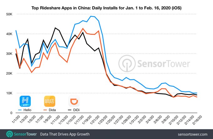 One of the many economic fallouts related to COVID-19 coronavirus concerns is a significant decline in the usage of Chinese ride-hailing applications. According to Sensor Tower data, downloads of the three most popular apps — Hello, Didi and Dida — were down 75% year-over-year during the week of February 10 compared with the same time frame in 2019. Meanwhile, people staying home have been ordering food and groceries more often. Overall downloads of the top 10 apps in the food-ordering category increased by 68% from January 13 to the week of February 3.
