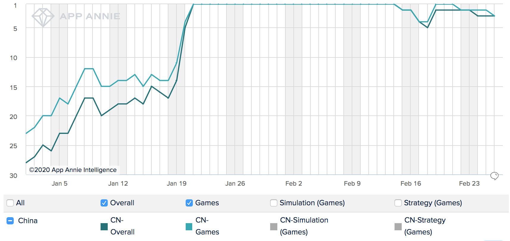 Data from market research firm App Annie shows that the title remained the most downloaded app in China from late January through most of February, up from No. 28 at the beginning of the year.