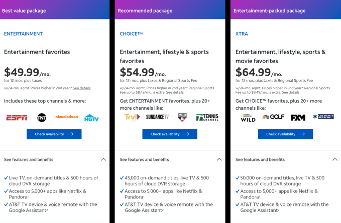 But offering a streaming service with a traditional pay-TV business model attached is an odd strategy on AT&T’s part that fails to address the main reasons that consumers were cutting the cord with traditional pay-TV providers in the first place. Mainly, pay-TV services cost too much and customers felt they were nickel-and-dimed with fees. That hasn’t changed here. In addition, there’s plenty to watch today on much more affordable services, like Netflix, Hulu, Amazon Prime Video and Disney+, for example. And there’s more still, if you’re willing to tack on a few more dollars per month for over-the-top subscriptions of premium channels, like Starz, Showtime or AT&T’s own HBO.