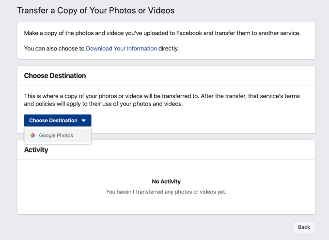 Though it’s not entirely clear why there’s no option offered as yet within Facebook to port direct to any of these other services. Presumably additional development work is still required by the third party to implement the direct data transfer. Asked about this the spokesman confirmed Google Photos is the only option for now, saying it’s “a first step” which he claimed “provides stakeholders with a tangible tool to assess while other companies join the DTP and we work toward transfers to different services and data types.”