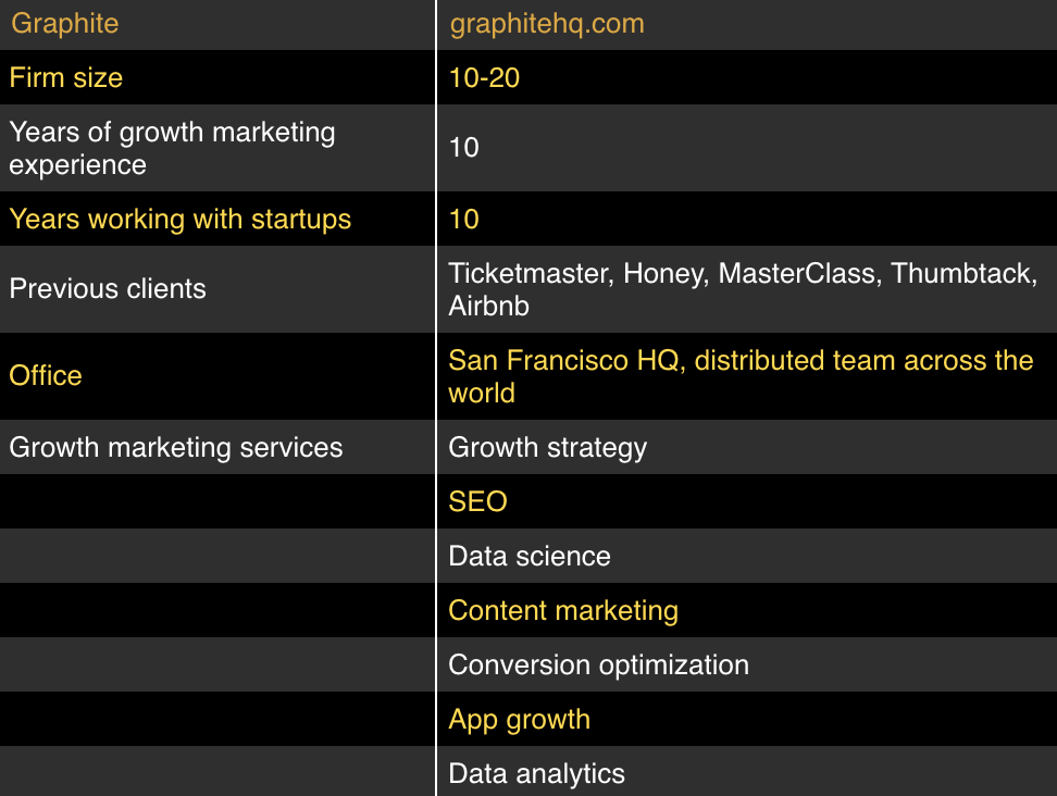 Graphite is part of a new wave of growth marketing consultancies launched by former product leaders at successful startups. With a specialization in SEO, and a client list that has included Masterclass, Thumbtack, Honey, Personal Capital, and more, its goal is to help make the difference for an ambitious company with product-market fit.
