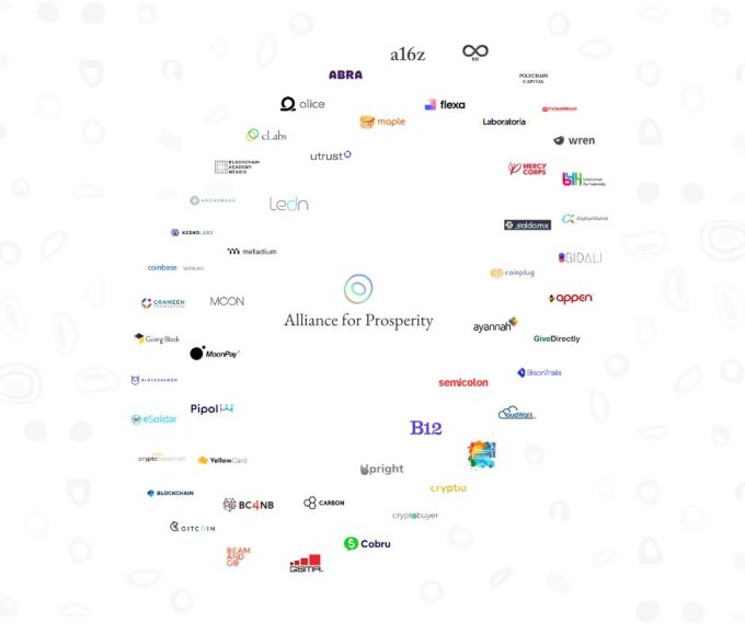 Abra, Alice, AlphaWallet, Anchorage, Appen, Ayannah, Andreessen Horowitz, B12, BC4NB (Blockchain for the Next Billion), BeamAndGo, Bidali, Bison Trails, Blockchain Academy Mexico, Blockchain.com, Blockchain for Humanity (b4h), Blockchain for Social Impact (BSIC), Blockdaemon, Carbon, cLabs, CloudWalk Inc, Cobru, Coinbase, Coinplug, Cryptio, Cryptobuyer, CryptoSavannah, eSolidar, Fintech4Good, Flexa, Gitcoin, GiveDirectly, Grameen Foundation, GSMA, KeshoLabs, Laboratoria, Ledn, Maple, Mercy Corps, Metadium, Moon, MoonPay, Pipol, Pngme, Polychain, Project Wren, SaldoMX, Semicolon Africa, The Giving Block, Utrust, Upright, Yellow Card, and 88i. [Update: Ledger joined this morning.]