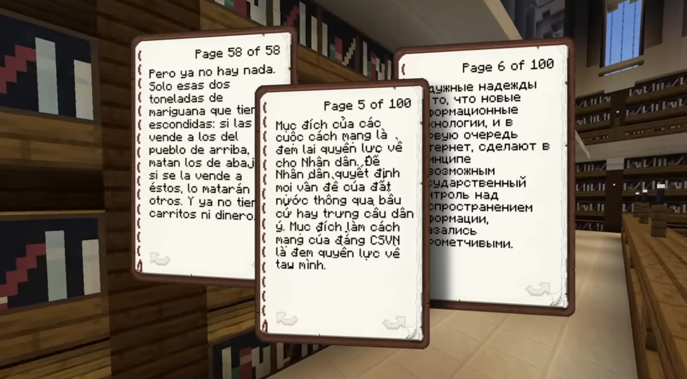 The library has a handful of wings, each dedicated to a different country, and each with a series of articles banned in those places, or their authors chased out or even killed. They’re presented in plain text inside Minecraft’s craftable books — not exactly the easiest way to take in these important essays and reports, but better than nothing.