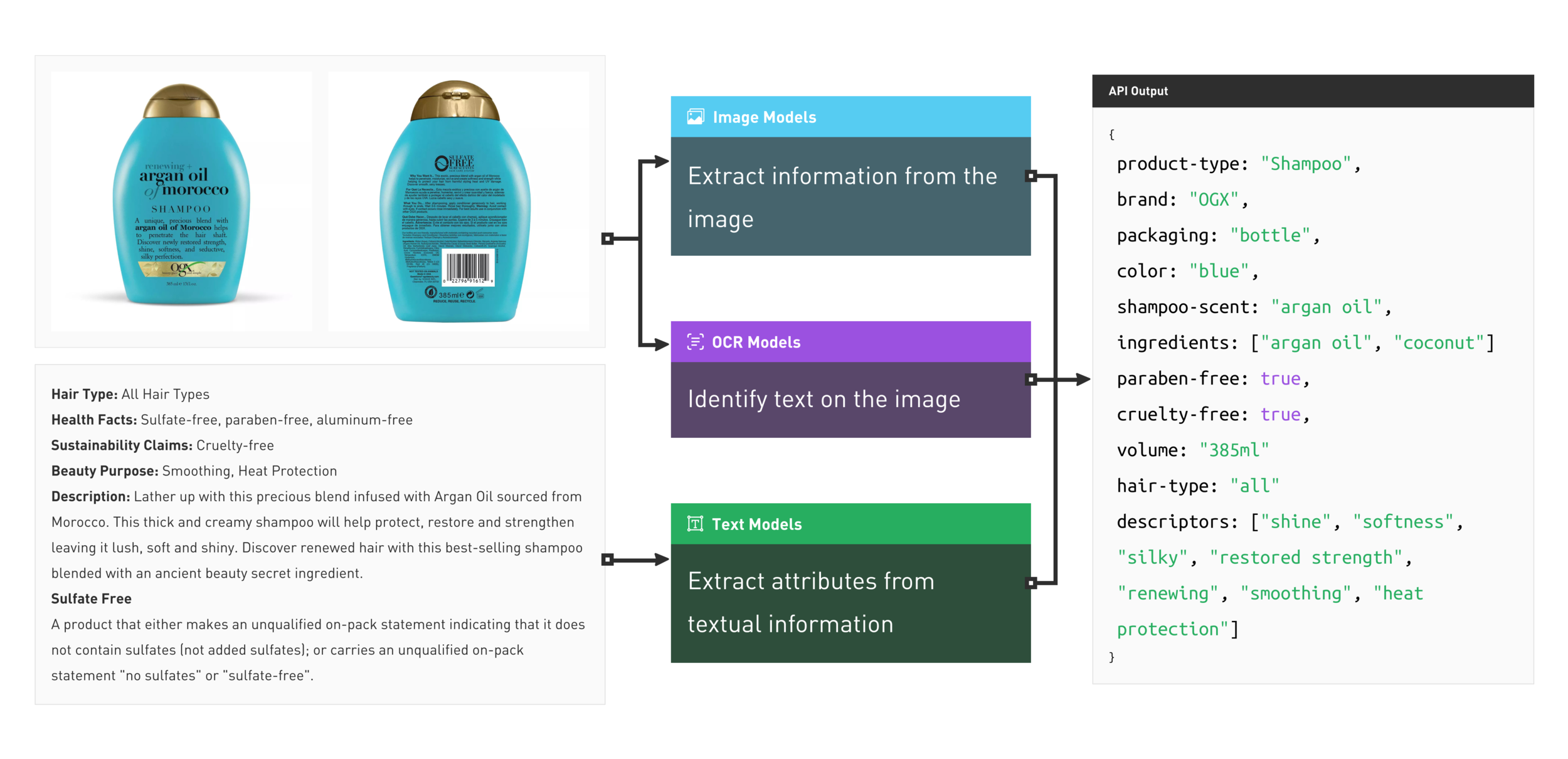 The model was initially aimed at fashion and clothing in general, but with the right training data it can apply to plenty of other categories as well — the same algorithms could find the defining characteristics of cars, beauty products and so on. Here’s how it might look for a shampoo bottle — instead of sleeves, cut and occasion you have volume, hair type and paraben content.